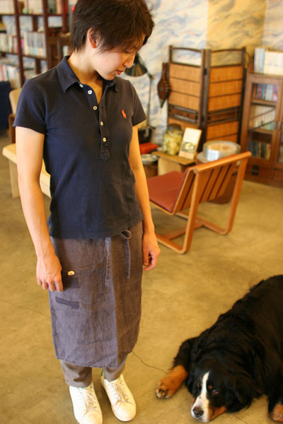近所で拾ったエゾシカの角の釦で作ったエプロンです。