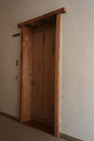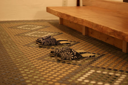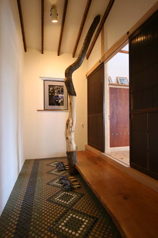 こちらは玄関。帯広の建材屋さんの倉庫に眠っていた昔の丸タイルを土間に使用。
