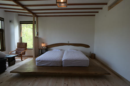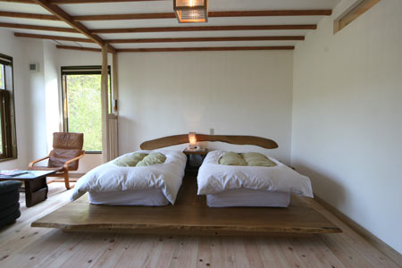 ベッド。家族構成に応じてマットレスをくっつけたり離せたりできます。