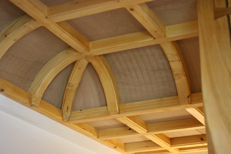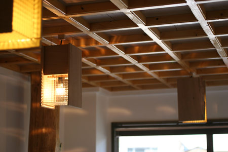 格天井。曲面部分も無垢の一枚板です。温泉に一晩浸けて曲げました。