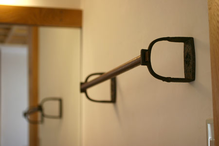 馬具の鐙(あぶみ)をタオル掛けに再利用。