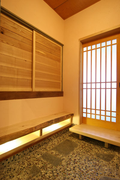 玄関内部。靴を脱ぎ履きする時用にベンチを据え付けました。