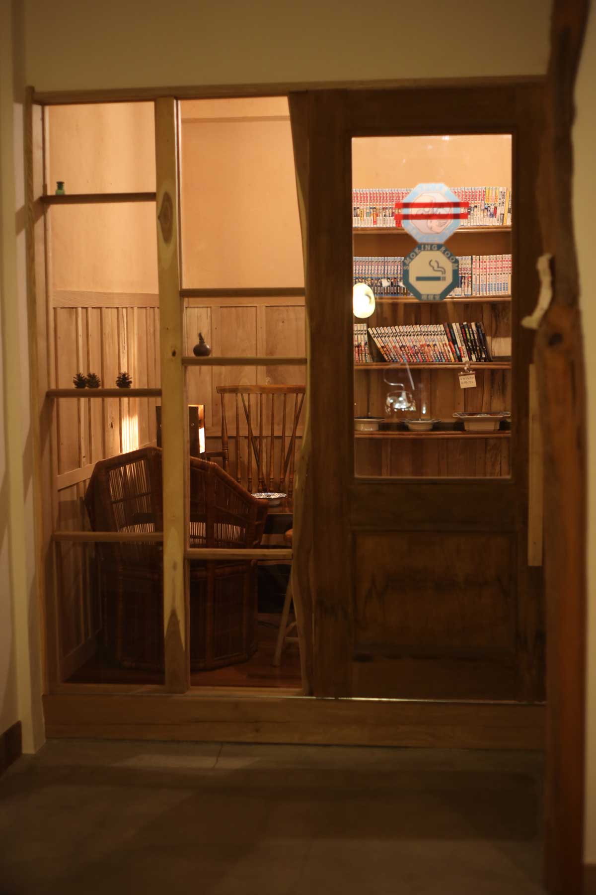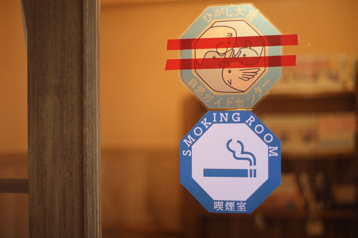 喫煙室入口のドアは旧ガイドセンターのものを流用。