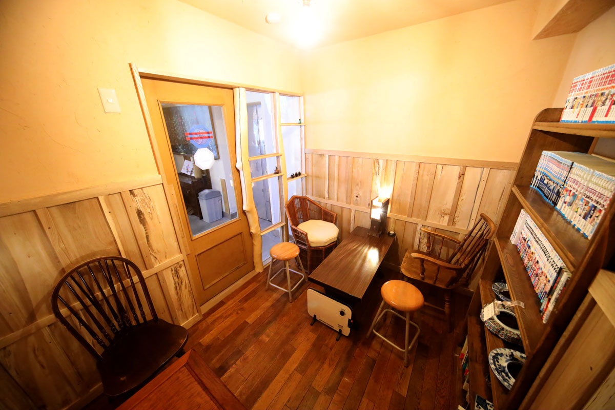 喫煙者の肩身が狭くないように、ゆっくりしてもらえるような、非喫煙者も入りたくなるような喫煙室を作ろう!ということで椅子は6席、本棚配置、珪藻土と地元木材で仕上げました。